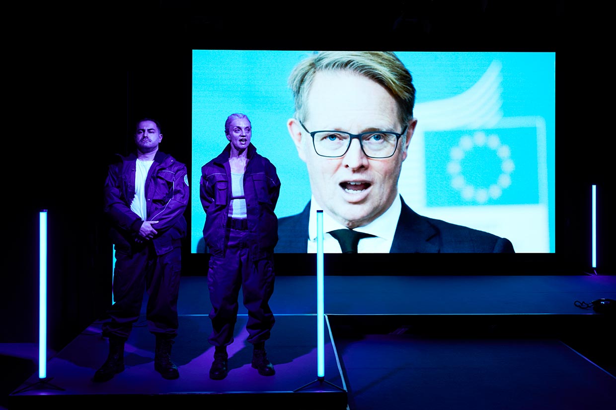 Wie kommt es zu diesem Widerspruch? Ist er systemimmanent, ja möglicherweise gewollt? Wird am Rande unseres Sichtfeldes die Aufrüstung unserer Grenzen vorangetrieben? „Frontières Extérieures“ geht der Frage nach, wie es zu entmenschlichenden Dynamiken in Grenzgebieten kommen kann und entwirft ein Psychogramm der verantwortlichen politischen Akteur*innen zwischen Kaffeetasse und Pushback, zwischen geheimen Gefängnislagern und Stempelkissen.