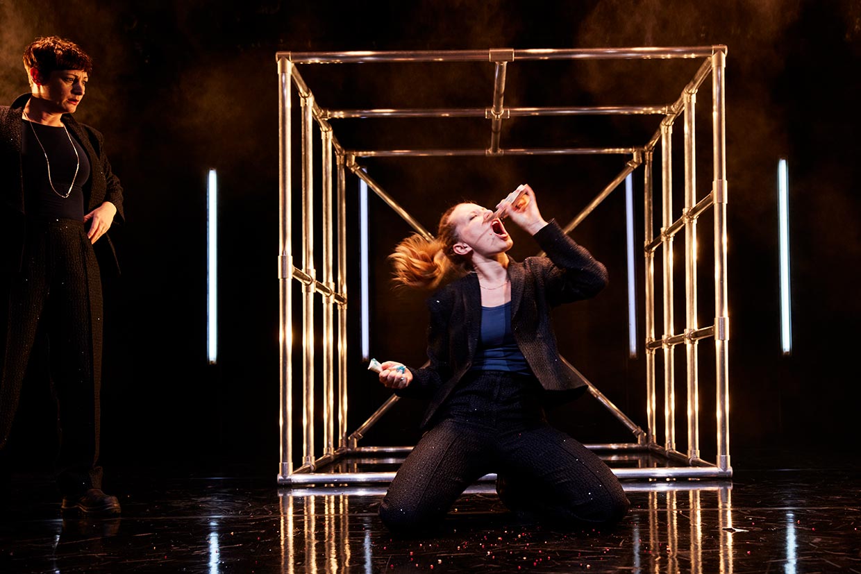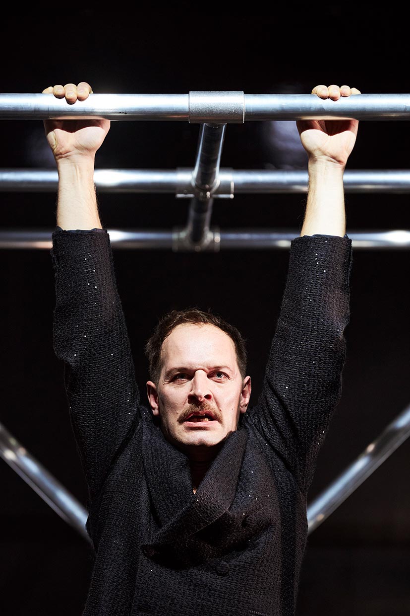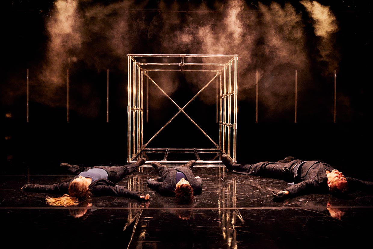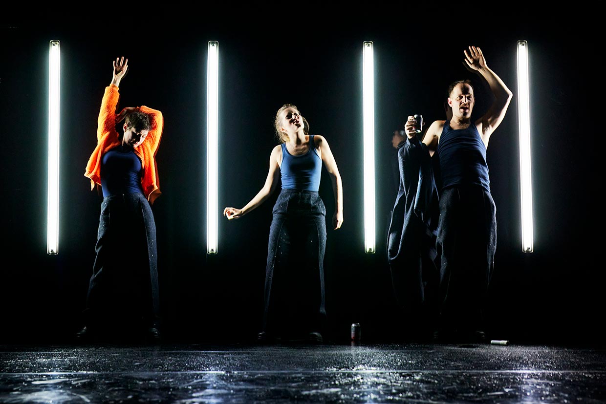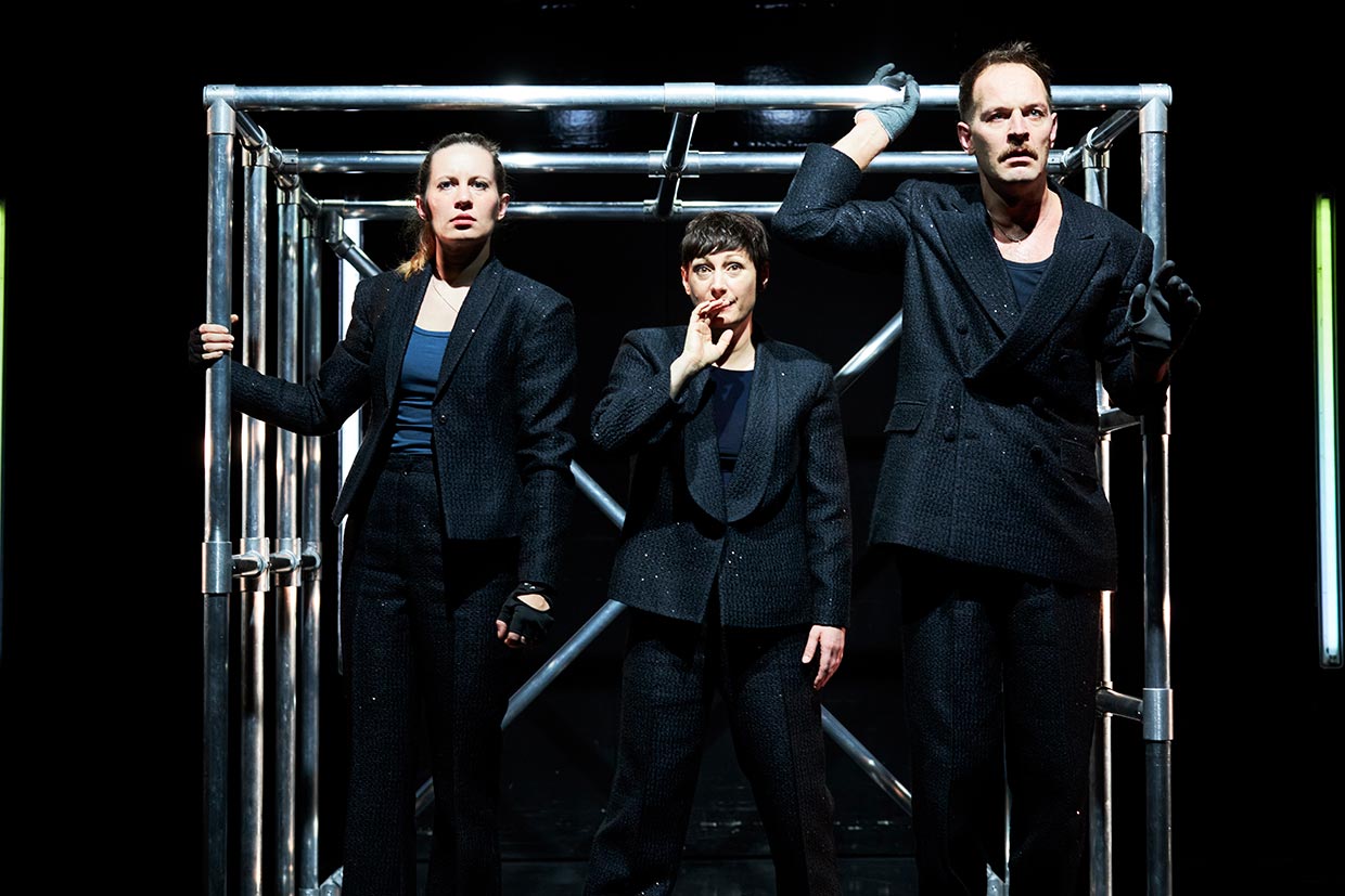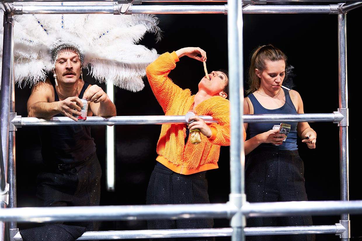Drei Figuren hängen an einem Kronleuchter. Ein Sinnbild in diesem Stück für ihren sogenannten Aufstieg, während ihre polnischen Mütter sich noch als Gastarbeiterinnen beim Putzen und Spargelstechen verdingen mussten. Aber das Abrutschen und der Fall ins Bodenlose, Unsichere, drohen jederzeit. Wann ist der Aufstieg, die Anpassung an das deutsche Bürgertum wirklich „geschafft“? Wie fragil sind die erhaltenen Privilegien in einem gesellschaftlichen Umfeld, das Zugehörigkeit stets anhand von Herkunft und sozialer Klasse kategorisiert? Und was hat das eigentlich mit der deutschen Geschichte und wie sie erzählt wird zu tun?