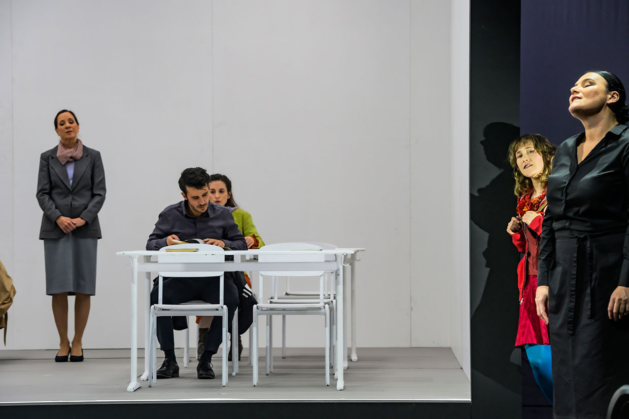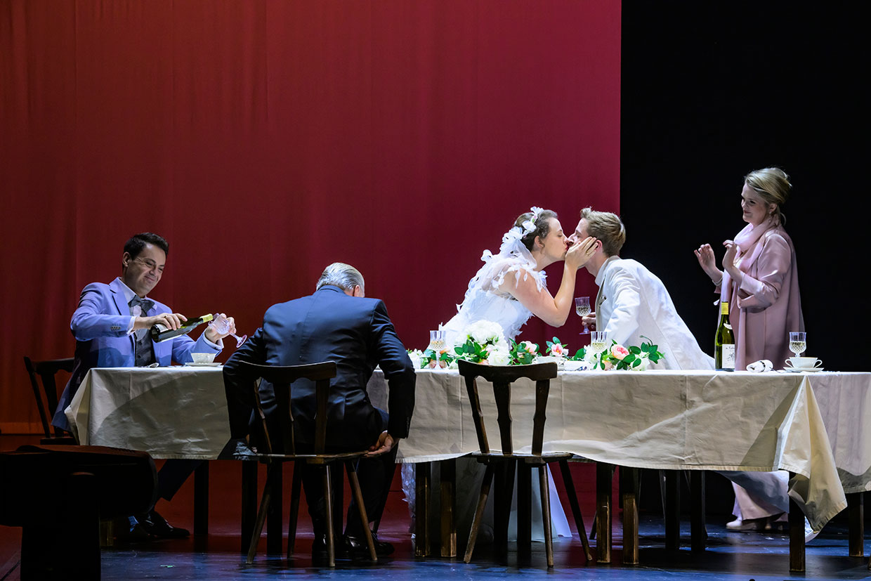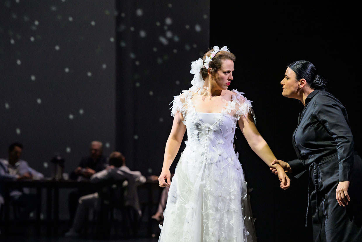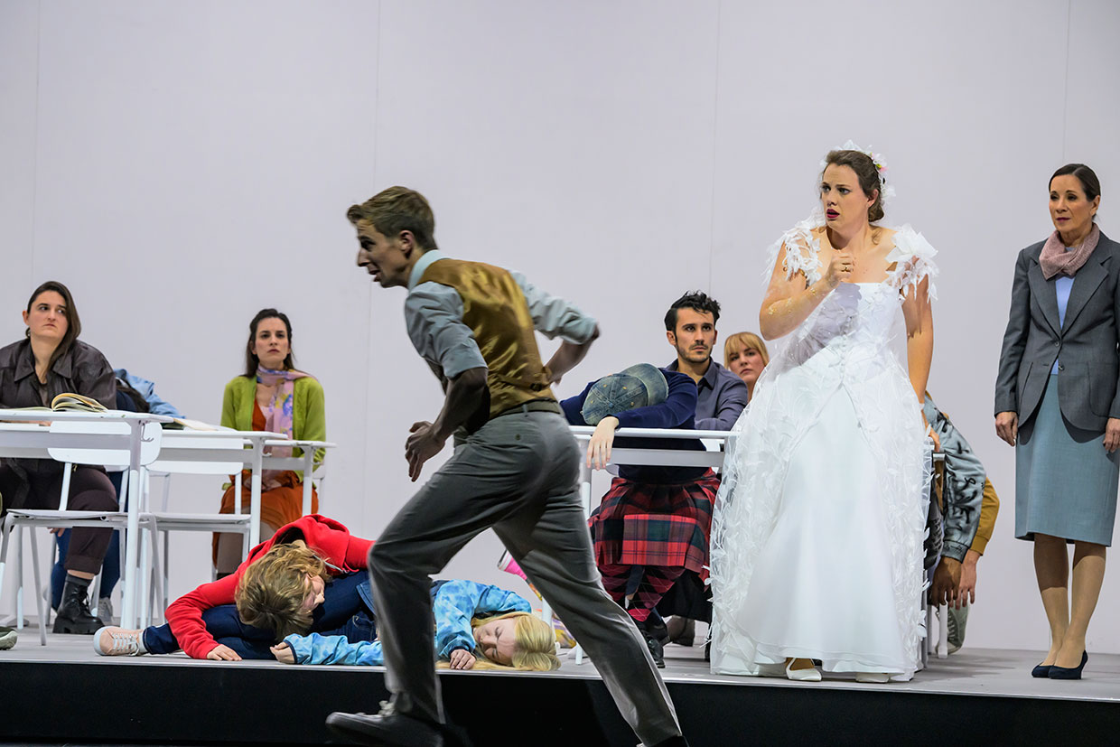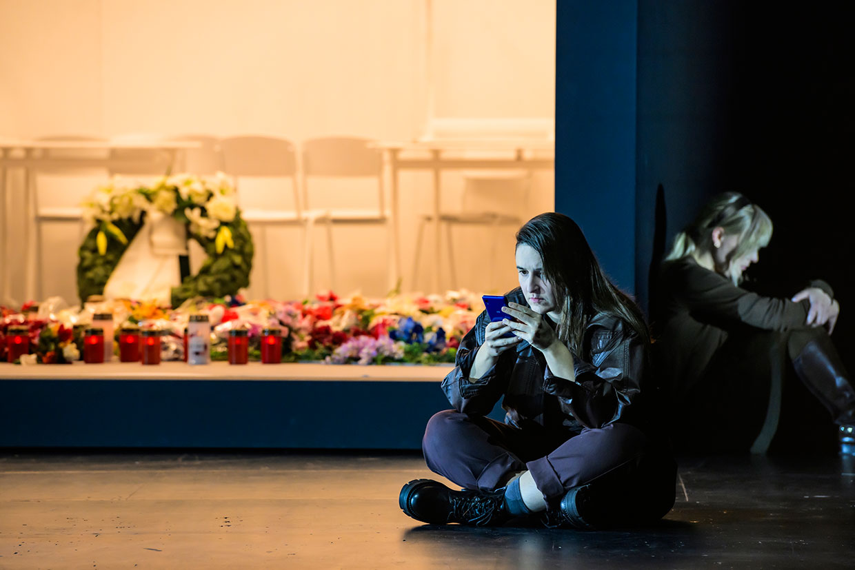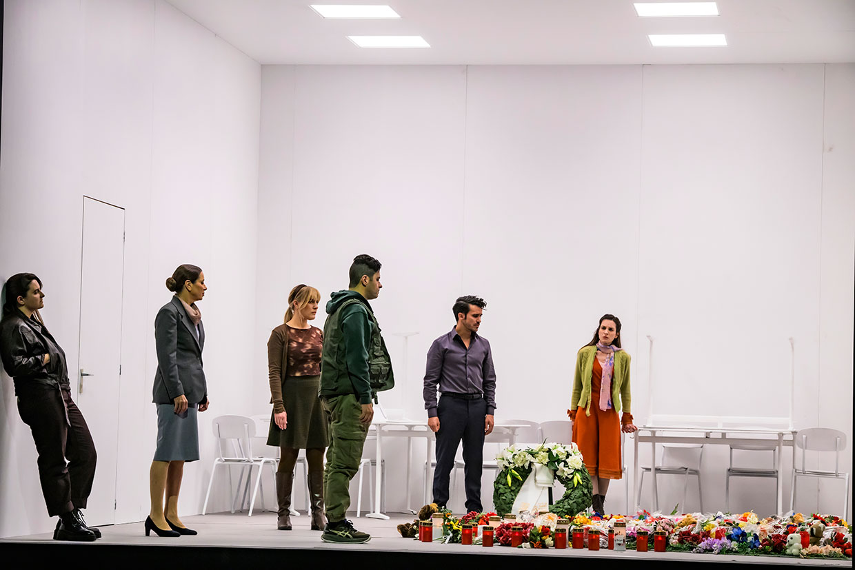 Eine kleine Familie und wenige Freunde feiern die Hochzeit von Tuomas und Stela. Doch einer fehlt: Tuomas’ älterer Bruder, über den nicht gesprochen werden darf. Zehn Jahre zuvor ist er in seiner Schule Amok gelaufen und hat neun Mitschüler*innen und einen Lehrer getötet. Aus den Erinnerungen der Überlebenden wird die Tat gegenwärtig, ihre unbegreifliche Grausamkeit, das Leid, das sie verursacht, aber auch die Vorgeschichte des Jugendlichen, der sie begeht. In ihrer letzten Oper stellt die finnische Komponistin Kaija Saariaho mit antiker Wucht die Frage nach Schuld und Verantwortung für ein Verbrechen in unserer Gegenwart.