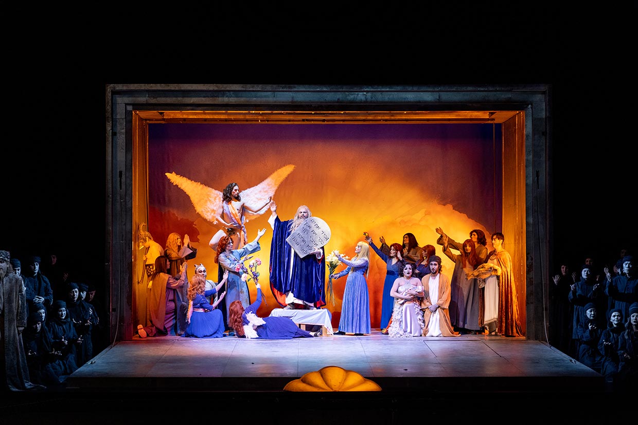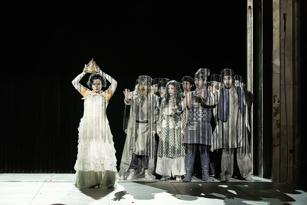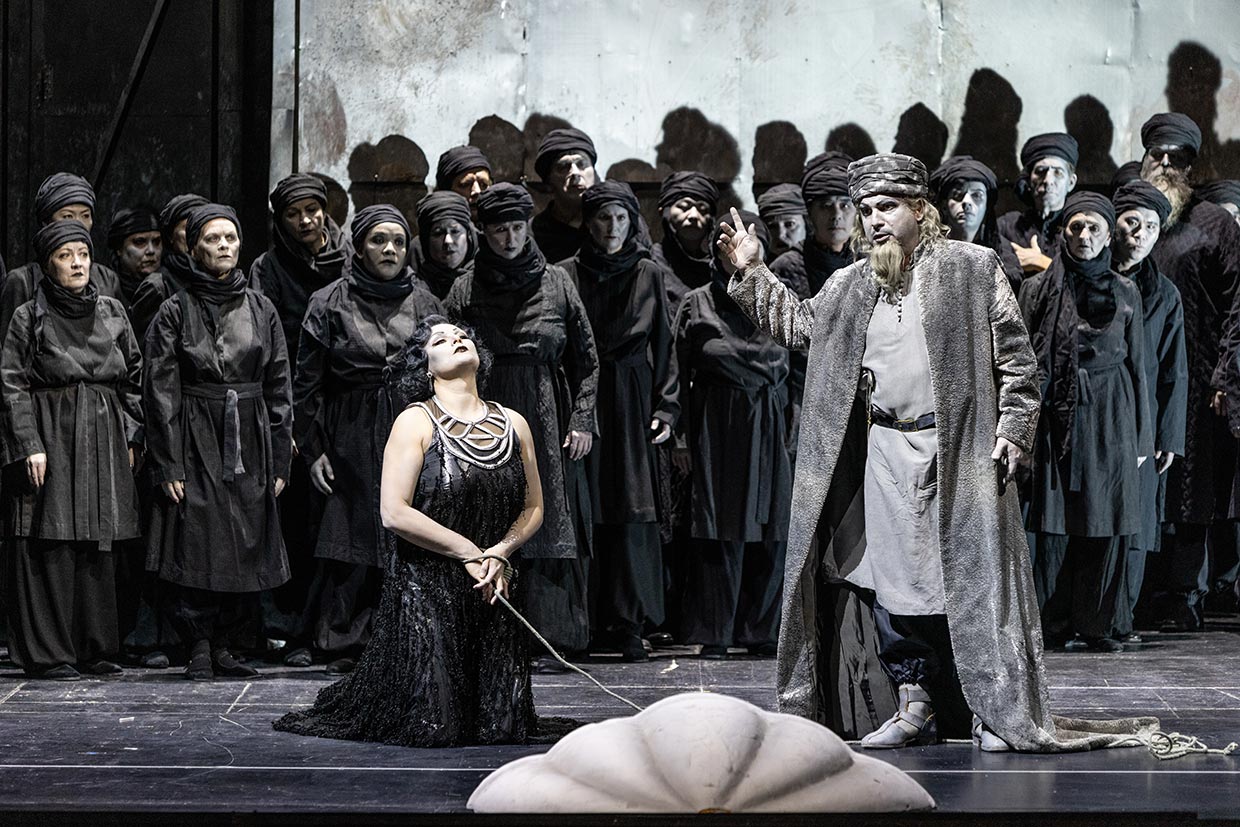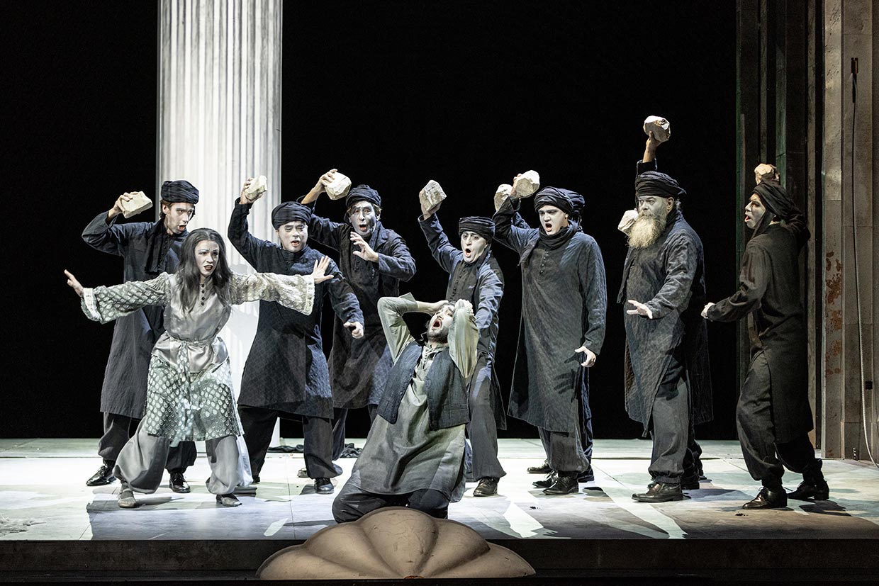 Mit alttestamentarischer Wucht vertont Verdi den scheinbar aussichtslosen Widerstand des jüdischen Volkes gegen den babylonischen Gewaltherrscher Nabucco. Durch eine göttliche Erleuchtung des Tyrannen ist der Freiheitskampf der Hebräer schließlich erfolgreich. Die beliebte, schon mehrmals wiederaufgenommene Nürnberger Inszenierung spart bei aller Tragik auch nicht mit Humor und nähert sich dem wuchtigen Drama mit den Stilmitteln des Stummfilms.